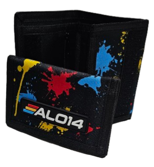 Cartera de tela con los colores de Fernando Alonso, con cierre de velcro y compartimentos para monedas, llaves, billetes, tarjetas y documentación personal.