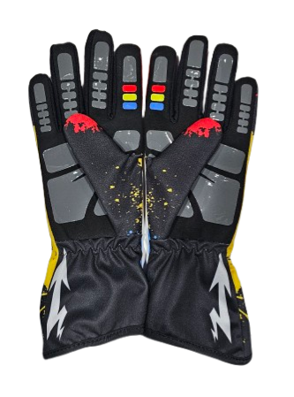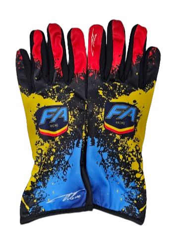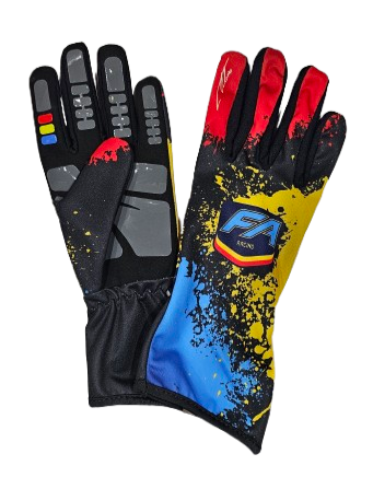 Guantes de karting inspirados en los colores característicos de Fernando Alonso, con la firma de Fernando en la parte superior del dedo índice y las flechas de sus cascos serigrafiadas en las muñecas.